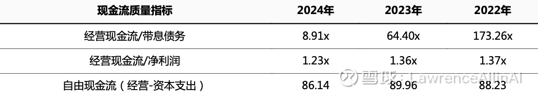 2.盈利质量优异:经营现金流持续高于净利润(1.2-1.4倍),自由现金流稳定在86-90亿元区间,验证利润含金量。