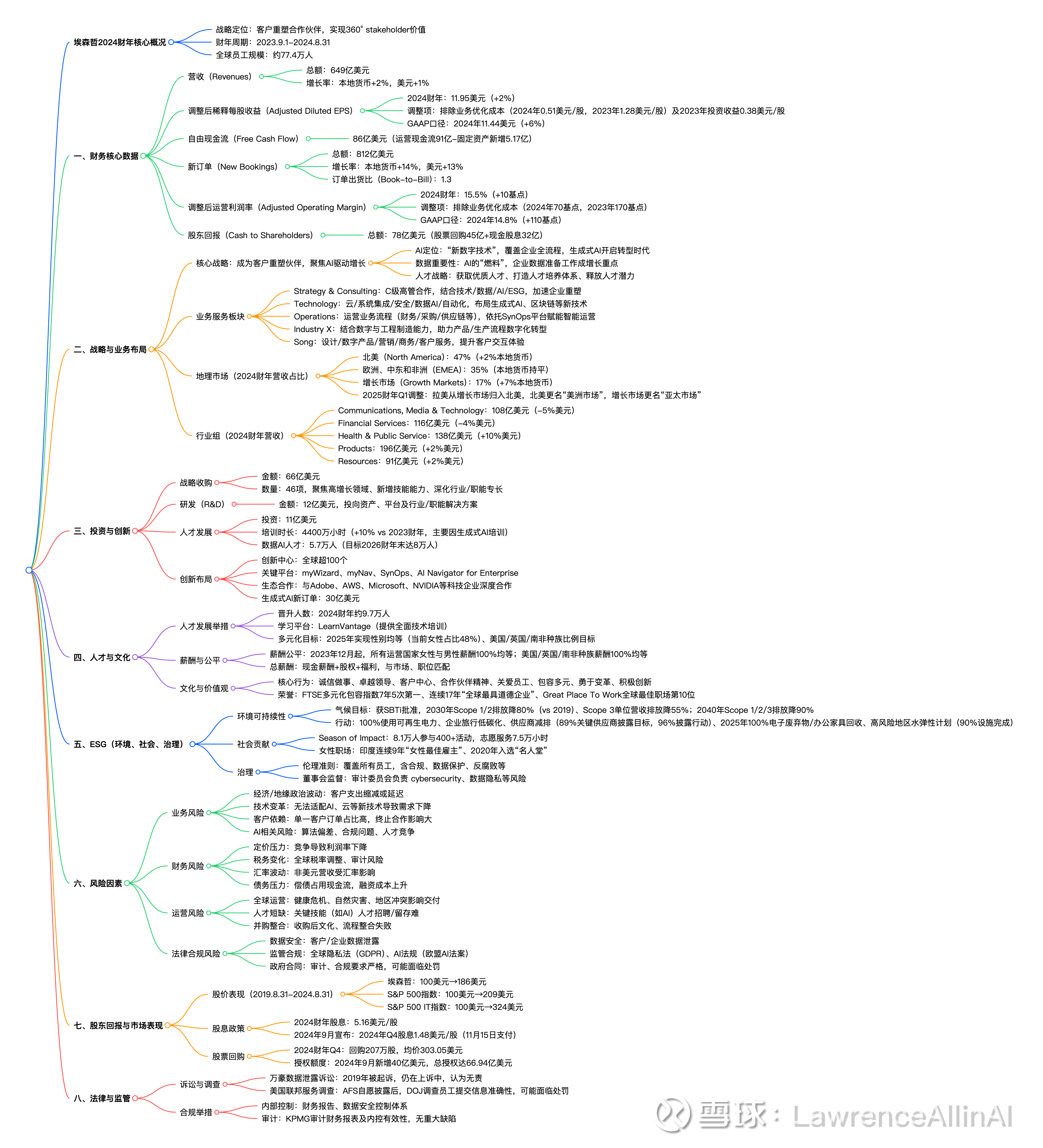 结论:埃森哲在收入增速放缓背景下,通过成本管控实现利润提升,但资产运营效率下降和资本回报率走低值得关注。大规模并购投资(全年46起收购)虽短期影响现金流,或将增强长期数字服务能力。建议重点关注应收账款周转改善与并购整合成效,以维持盈利质量与股东回报的平衡。