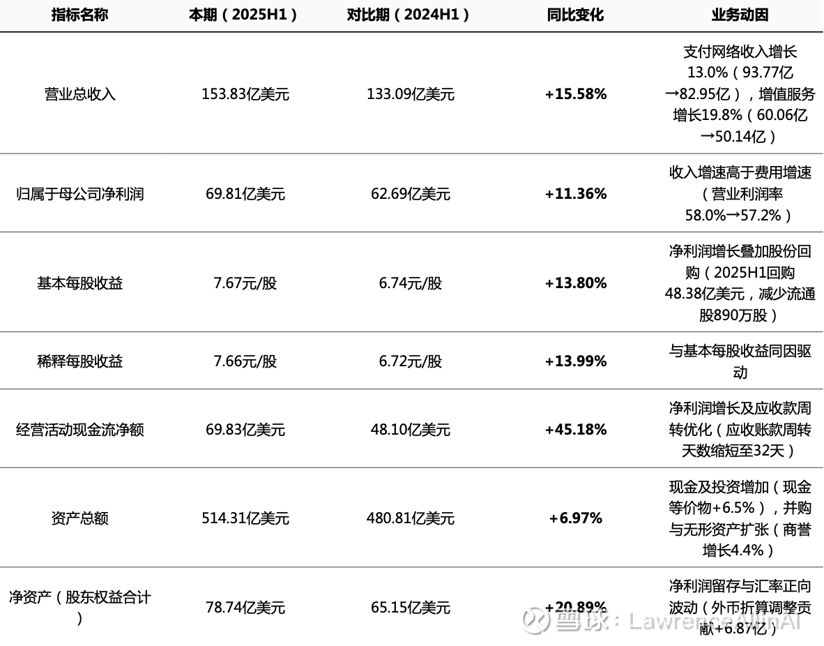 结论:万事达2025H1展现强劲增长动能,核心支付网络与增值服务双轮驱动,现金流与资产质量同步提升,但需关注全球税制改革对利润率的长期影响。