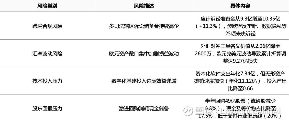 洞察:支付网络特有的跨境属性使汇率敏感性达到行业峰值(外汇损益占利润6.1%),同时93.5亿商誉对应27个司法辖区的合规成本,与9.3亿诉讼准备金形成监管套利风险。