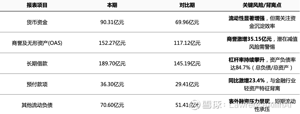 洞察:金融行业典型的高杠杆特征持续强化,但商誉激增与预付款异常增长暴露资产质量隐患。流动性扩张(现金+31%)与负债增速(总负债+25%)不同步,需关注资本结构的可持续性。