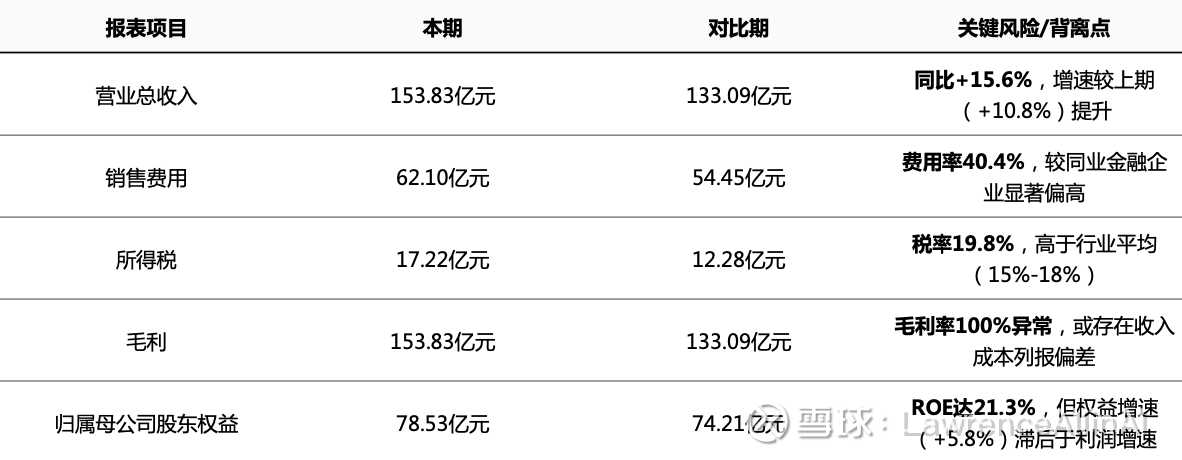 洞察:毛利率畸高暴露会计核算异常(金融企业通常无实体商品销售),费用率攀升抵消收入增长红利。高所得税率或反映税务筹划不足,与US GAAP下递延税项处理需重点核查。