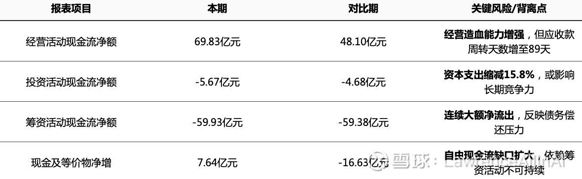 2.激进债务收缩策略:筹资活动连续三年大额净流出(-47至-60亿元),反映债务偿还或股东回报力度持续加大