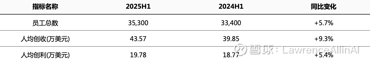 1.规模效应凸显:员工总数同比增长5.7%的同时,人均创收增幅达9.3%,显示新增员工贡献超出边际成本,组织扩张效率显著;