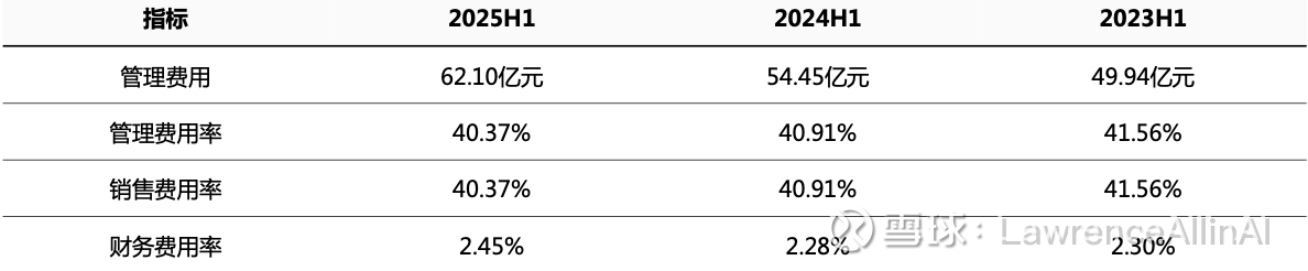 1.费用结构高度趋同:管理费用与销售费用率完全同步变动且数值一致,两者在2023-2025H1期间均呈现小幅下降趋势(41.56%→40.37%),但绝对值逐年增长(管理费用+24%)。