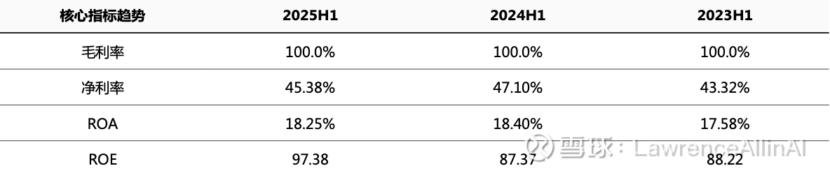 2. 净利率稳定在43%以上高位,2025H1虽较上年微降1.72个百分点,仍保持超强费用控制能力