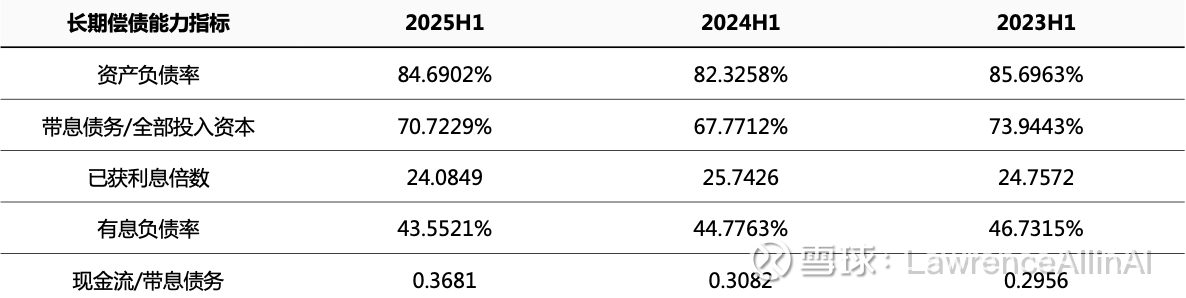 1. 资产负债率在85%高位波动,2024H1短暂改善后2025H1反弹,债务资本结构存在优化空间