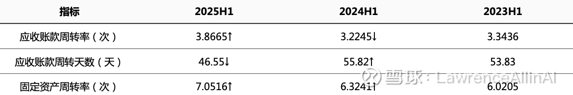1.应收账款效率波动上升:2024H1周转率下降至3.2245次(天数增至55.82天),但2025H1显著回升至3.8665次(天数缩短至46.55天),显示催收管理短期改进效果显著。