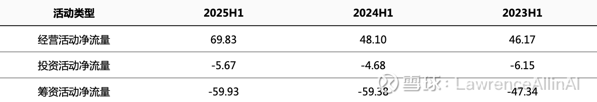 1.经营活动持续正向造血:连续三年经营性净现金流保持46-70亿元规模,2025H1同比增幅达45%(48.10→69.83亿元),核心业务创现能力显著增强
