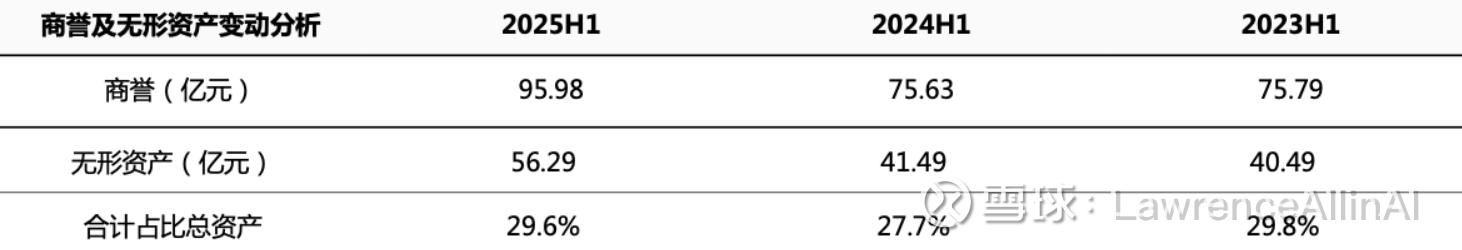1. 商誉近两年显著增长,2025H1达95.98亿元(+26.9% vs 2024H1),可能源于并购活动。