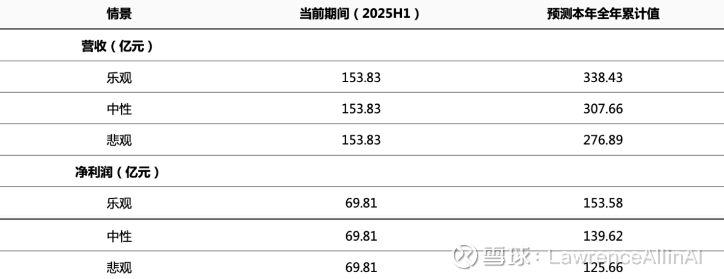 1.中性情景依据:假设全年营收与净利润为上半年两倍。过去三年H1营收占比稳定(2023-2025年H1数据连续性强),且无季节性波动提示,保守按线性外推。