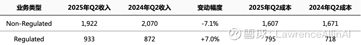 Regulated业务收入同比增长7.0%,成本增幅较小(+10.7% vs 收入+7.0%),可能显示定价权或运营效率提升。