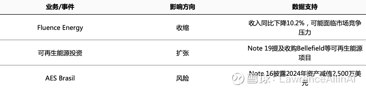 结论:AES主营业务呈现区域与业务类型分化,Regulated业务和南美市场为增长支柱,NonRegulated及美国传统业务面临收缩压力,同时通过并购加码可再生能源转型,但需关注资产减值风险(如Mong Duong、AES Brasil)。