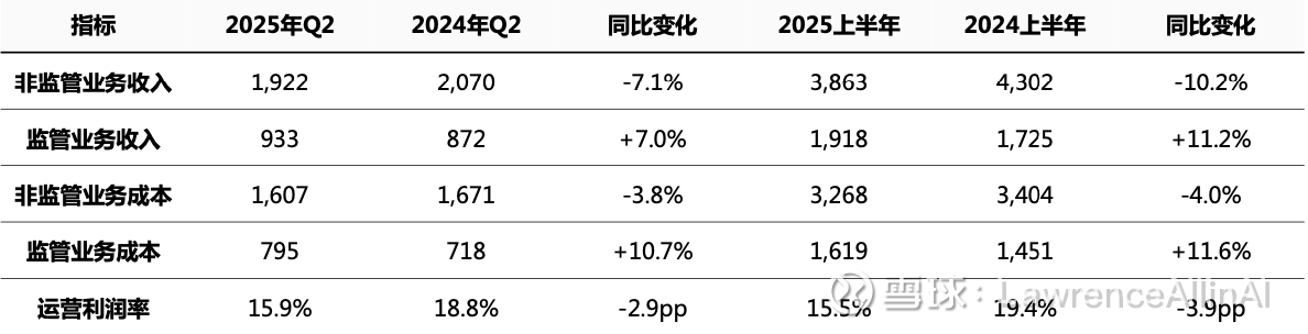 1.收入结构转型:监管业务收入连续增长(Q2 +7%,上半年 +11.2%),而非监管业务收入显著下滑(Q2 -7.1%,上半年 -10.2%),反映行业向政策驱动型业务倾斜。