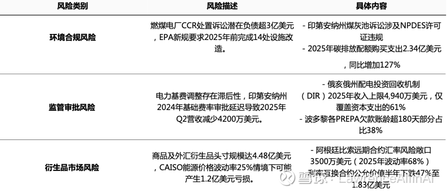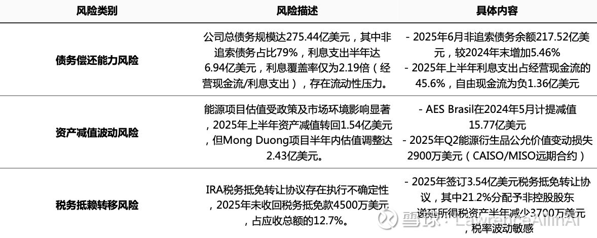 总结:AES面临债务结构刚性化与能源转型双重挑战,建议优先处置非核心资产(当前持有待售资产8.62亿美元),优化浮动利率债务置换,并加强衍生品动态对冲策略。监管合规成本上升已成行业性风险,需加速储能项目投建(当前在建1.2GW)以提升税务抵免资产质量。