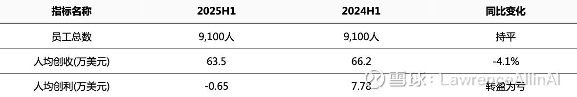 洞察:作为公用事业行业企业,2025上半年人均创收下降4.1%至63.5万美元,同时人均创利从上年同期的7.78万美元转为亏损0.65万美元,显示出经营效率显著下滑。这种从盈利到亏损的剧烈波动在稳定属性的公用事业领域较为罕见,可能受能源价格波动、资产减值(财报显示2025H1资产减值损失1.05亿美元)等特殊因素影响。