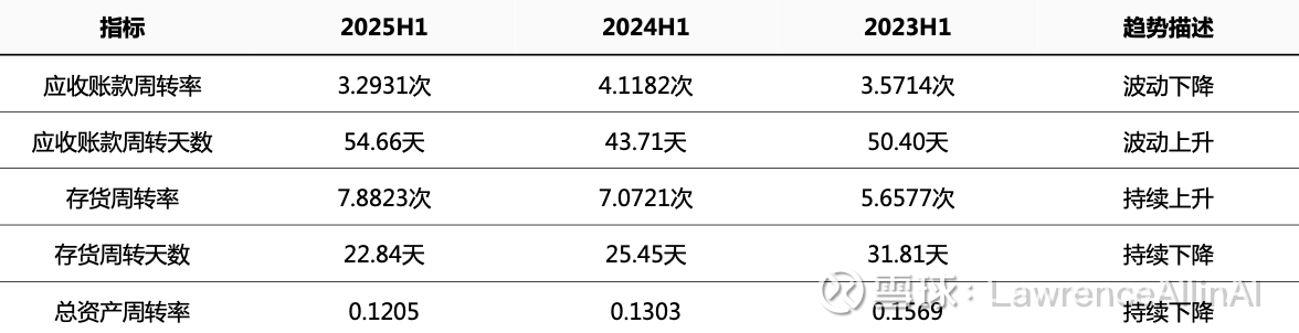 1.回款效率承压:应收账款周转率连续两年下降(2024H1→2025H1),周转天数较2024H1增加10.95天,显示客户账期拉长,可能影响现金流稳定性。