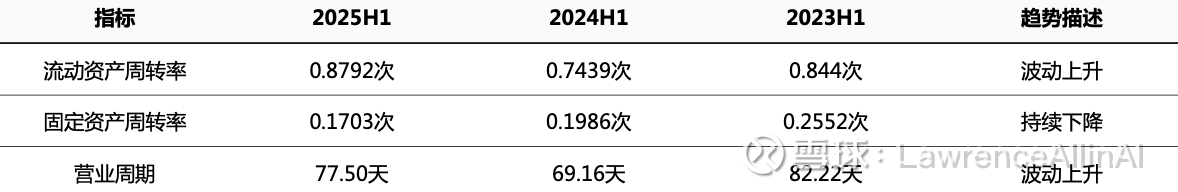 4.产能利用率下降:固定资产周转率连续三年下滑(0.2552→0.1703次),或指向设备老化、产能过剩问题,需关注长期投资效益。
