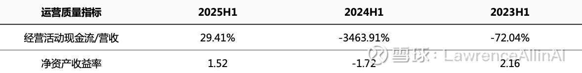1. 2025H1经营现金流显著改善,现金流/营收比转正至29.41%,显示运营质量提升