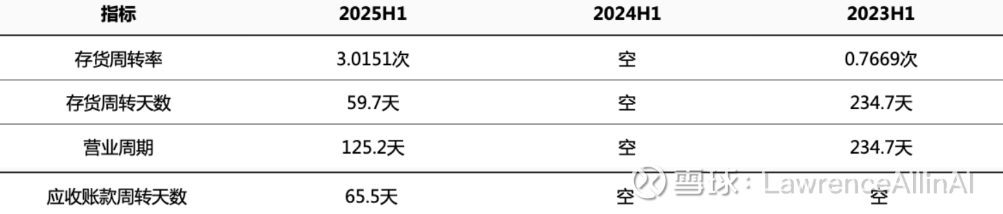 1.存货管理效率显著提升:2025H1存货周转率提升至3.0151次(2023H1为0.7669次),周转天数从234.7天大幅缩短至59.7天,表明库存流动性增强。