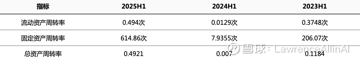 2.流动资产周转率波动显著:2024H1低至0.0129次(2023H1为0.3748次),2025H1回升至0.494次,反映短期资产使用效率不稳定,需警惕流动性风险。