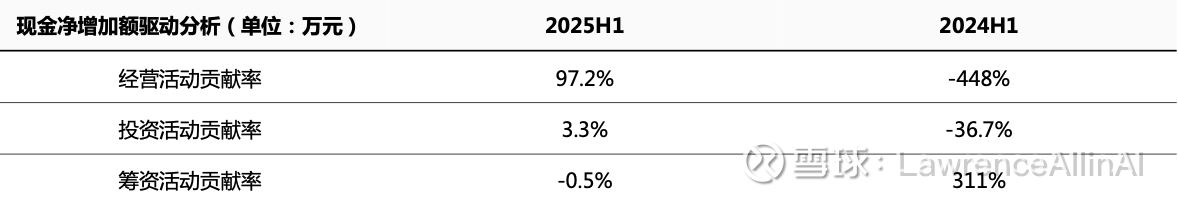2.筹资依赖度下降:2024H1现金净减少主要因经营活动负向波动且依赖筹资活动(311%贡献率),而2025H1筹资活动转为负贡献,印证企业减少外部融资依赖。