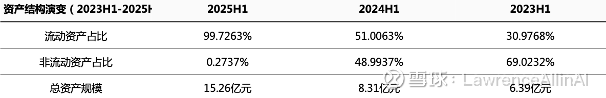 1.资产结构发生根本性逆转,2025H1流动资产占比激增至99.73%(较上年提升48.7个百分点),非流动资产几乎清零