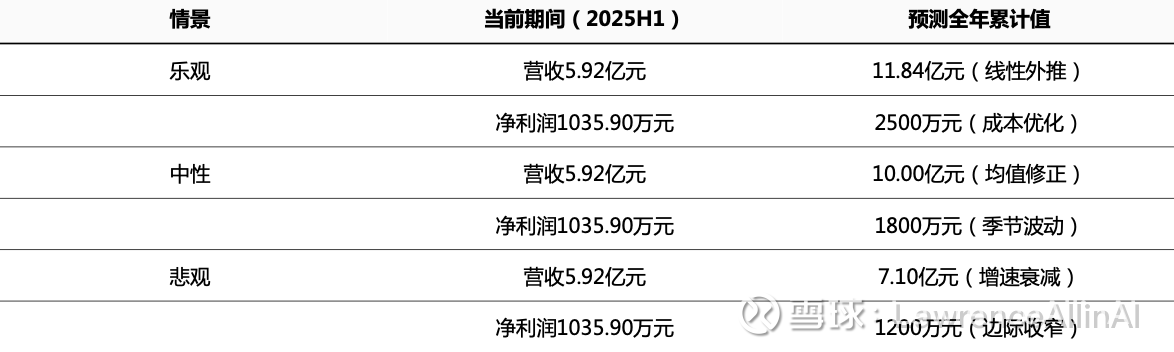 结论:核心矛盾集中于2024H1异常数据(营收暴跌/净利润转负)与2025H1的剧烈反弹,建议优先验证:1)会计政策变更时点 2)重大资产重组影响 3)特殊项目收入占比。在数据完整性受限情况下,中性情景假设H2维持H1营收规模的70%、净利润率保持8%更具审慎性。