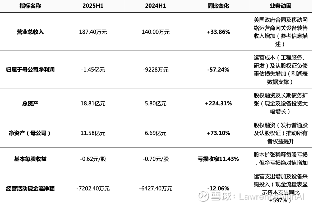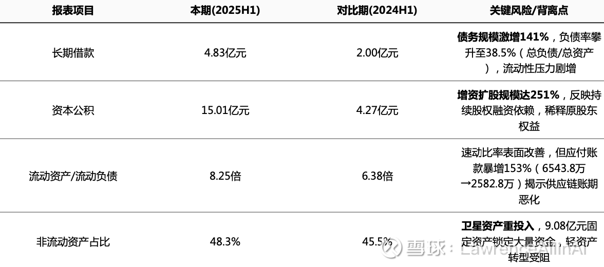 1.资产规模跃升:2023-2025H1总资产增速由负转正并加速扩张(-6.82%→+60.61%→+97.09%),反映大规模资本投入或融资活动,可能用于卫星通信基础设施建设。