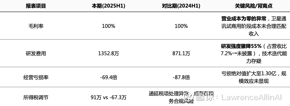 洞察:卫星通讯行业需持续高研发投入维持技术壁垒,但AST反常压缩研发支出,叠加成本核算瑕疵(零营业成本),利润表呈现"伪盈利、真失血"状态,商业模式可持续性堪忧。