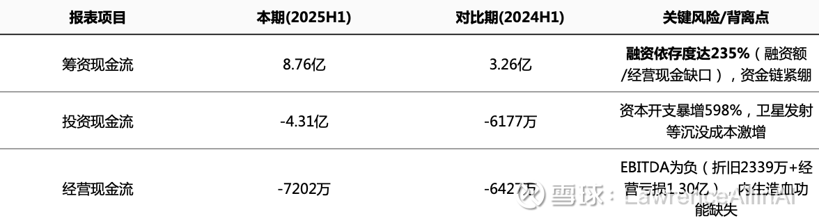4.现金流承压:经营活动现金流净流出扩大,投资活动支出激增(卫星制造投入),财务可持续性依赖外部输血。