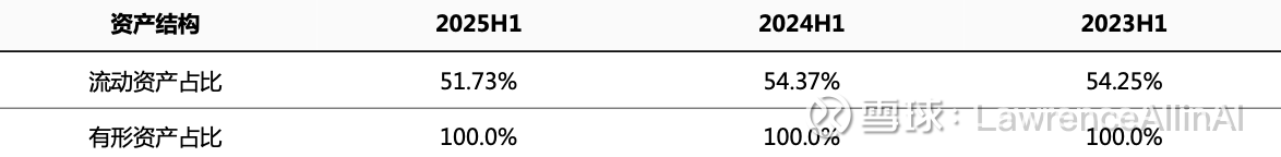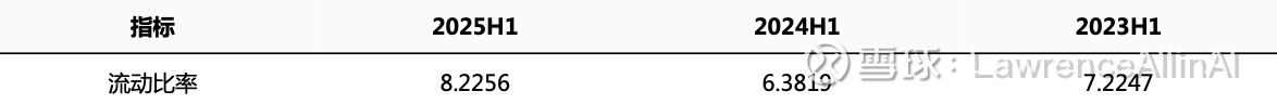 1.短期流动性充裕:各期流动比率均高于6,2025H1达到8.23,远超行业平均水平(通常2左右),流动资产对流动负债覆盖能力极强,短期违约风险极低。