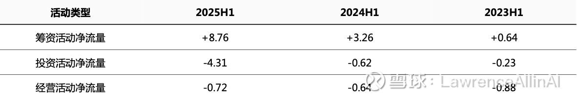 结论:企业处于高投入扩张阶段,现金流结构呈现"筹资输血-投资耗血-经营失血"特征,尚未形成内生造血能力。短期现金安全依赖大额股权/债权融资,但2025H1投资强度剧增可能加速消耗融资成果,需警惕现金流断裂风险。