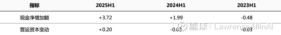 2. 运营效率边际改善:2025H1营运资本转为正向变动1972万元,但绝对值仅占现金增量的5.3%