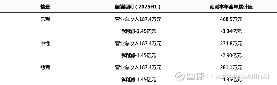 亏损加速但增速放缓:净利润亏损从2023H1至2025H1扩大318%,但增速从166%(2023→2024H1)降至57%(2024→2025H1)。乐观情景假设亏损增速进一步放缓至30%,中性按半年线性外推,悲观情景假设亏损增速回升至70%。