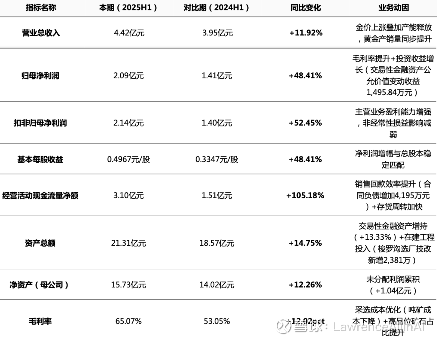 1.量价双升驱动增长:黄金销售均价同比上涨约9%,叠加选矿处理量提升(2000t/d技改项目投产),推动收入端双位数增长