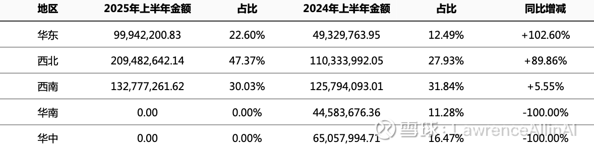 1.区域集中度提升:西北地区成为核心收入来源(占比47.37%),华东地区增速最快(+102.6%),贡献占比显著提升至22.6%。