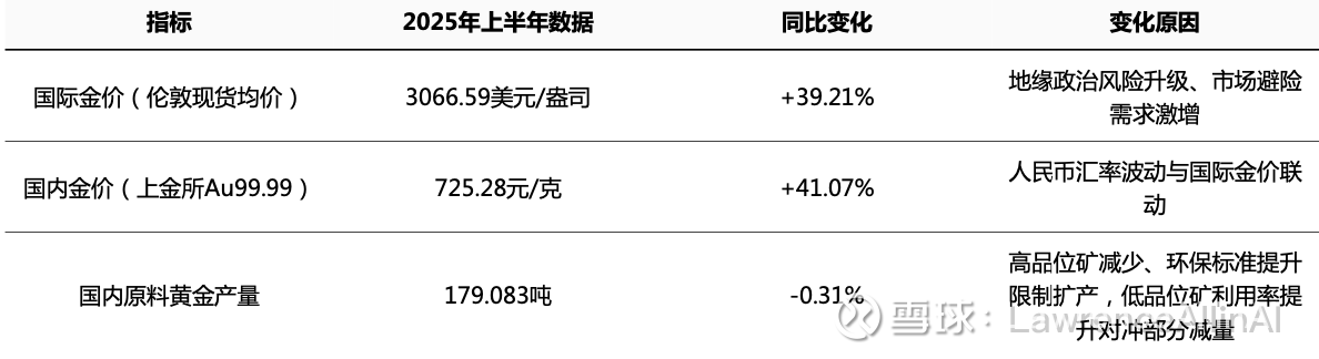1.价格高位运行但产量收缩:黄金价格同比涨幅超39%,但国内原料产量仍微降0.31%,反映行业面临资源品位下降与生产约束强化的双重压力,增产逻辑转向存量资源精细化开发而非规模扩张。