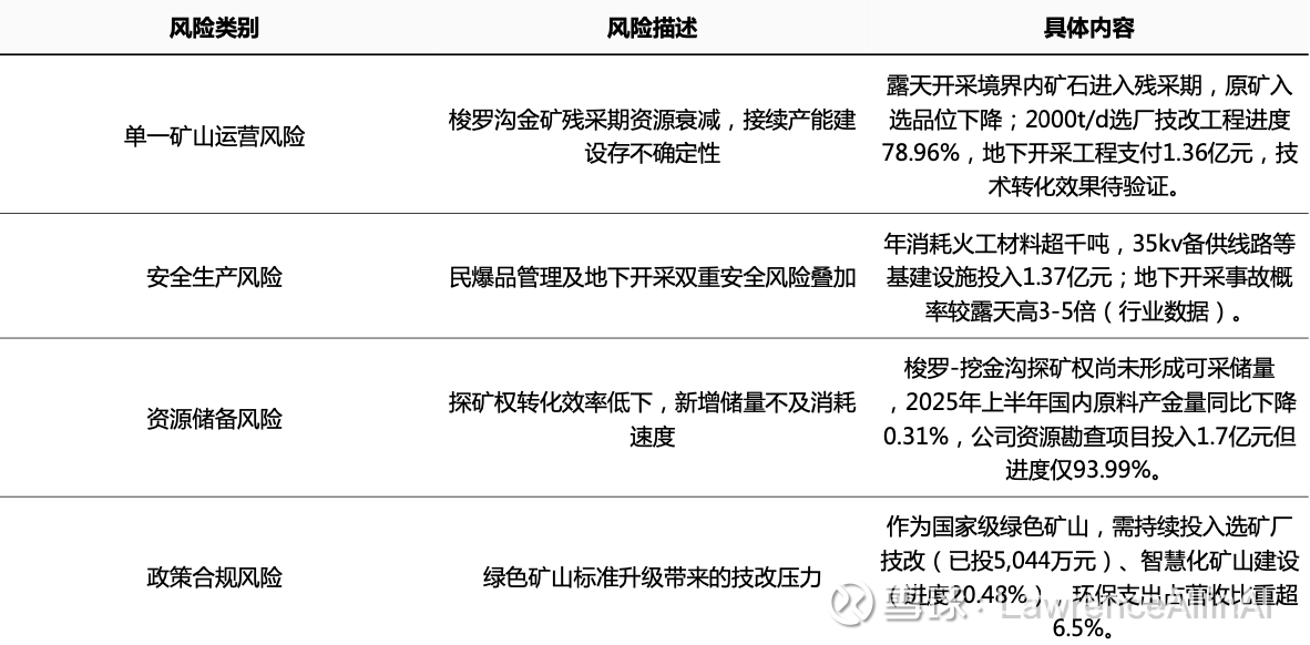总结:公司面临"价格依赖型增长"与"成本刚性上升"的双向挤压,叠加单一矿山资源衰减的硬约束。短期需强化套期保值与客户结构优化,中长期应加快探矿权转化和智慧矿山建设,在行业集中度提升趋势中巩固区位优势。