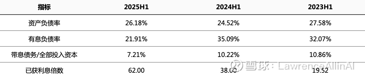 3.利息覆盖能力增强:已获利息倍数从2023H1的19.52倍大幅提升至2025H1的62.00倍,显示利润对利息支出的保障能力显著增强。