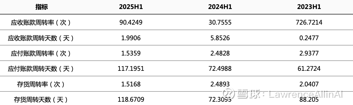 1.应收账款周转剧烈波动:2023H1周转率高达726.72次(周转天数仅0.25天),但2024H1骤降至30.76次(周转天数延长至5.85天),2025H1回升至90.42次,反映收款政策或客户信用管理存在显著调整。