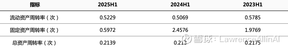1.固定资产周转率断崖式下降:2024H1固定资产周转率高达2.46次,但2025H1骤降至0.60次,可能与产能扩张未匹配收入增长或资产减值有关,需警惕固定资产投资效益。