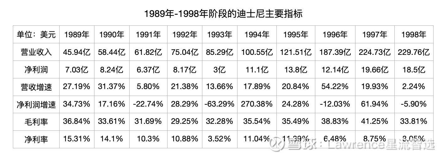 这是1989年到1998年10年间迪士尼的主要财务指标。差不多是$泡泡玛特(09992)$明年下来营收刚好会踏入的一个起始门槛。虽然不能简单类比,但具体的授权商品类目到2025年并没有发生太大的变化,主要都是日常消费品,服饰食品玩具为主。变化的是2025年现在因为技术提升,做产品的内容、渠道和供应链效率大大提升。也有一部分创新溢价比如玩具材质,盲盒商业模式设计,设计溢价提升,快闪店营销模式、货架和直播电商、短视频传播、创意内容生产形式、情绪需求捕捉和用户体验为本的运营等等。还有泡泡玛特整合好的自营玩具供应链到终端渠道。(目前以创意情感玩具类目为主)可以解释为什么目前泡泡玛特的毛利率和净利率会比89年到98年有这个差异。但是,随着营收增长达到一定规模,不可避免得会进入到多元化类目(授权或自营)。更多类目商品(手表、文具、个护用品等等)、乐园、电影、游戏、广告营销代言(如汽车)等等。这会把经营的业务扩大到超出自营的玩具类目,因此毛利率和净利率会下降(决定内生增长的跨产品类目资本支出,并购投资或授权不善还可能影响IP价值或亏损;目前的泡泡玛特其实已经有了一定的授权金收入,实际已进入多类目,只不过授权模式风险极低,表现为高净利率;跨地域开始进入全球市场,也是因为国内市场单一玩具类目和跨类目的自营和授权接近阶段性饱和;换句话说,高营收增速和毛利率净利率这几年会是阶段性峰值。这是由行业的商业模式决定的。)迪士尼是一个值得参考的模板。目前给泡泡玛特334.9亿美元,是不是太超前了呢?1989年经过10年后到1998年,迪士尼的市值才做到1998年当年是307-582亿美元之间(港币2389.84亿至4530.58亿),营收1789.26亿港元,净利润144亿港元,当年的PE16.59-32.3。迪士尼还拥有毋庸置疑的最优秀团队。授权业始祖,行业里从营销、创意、供应链和授权商品行业专家、法财税务、组织管理等。甚至连公认教材基本都是迪士尼团队写的,相关供应链的头部厂商是迪士尼带出来的。无论是市值代表的行业地位,到最近宣布的OpenAI合作表现的创意性、技术包容性与重视程度、韧性和勇于冒险的前瞻性,迪士尼一直是潮头,还在进步。