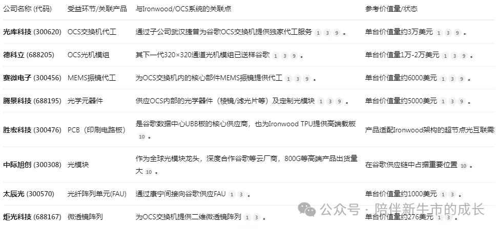 谷歌最新发布的第七代TPU芯片Ironwood,以及与之配套的光路交换(OCS)网络,确实为AI算力产业链带来了新的增长动力。其核心机遇主要围绕直接参与谷歌供应链和受益于技术路线扩散的公司。
