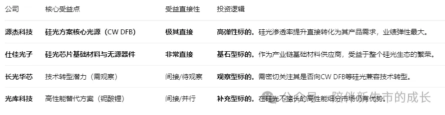 •结论:长光华芯是需要密切观察其战略转向的公司。如果它能成功切入硅光光源供应链,将重获增长动力;否则,可能面临市场份额被侵蚀的风险。当前其受益程度不如源杰科技直接。