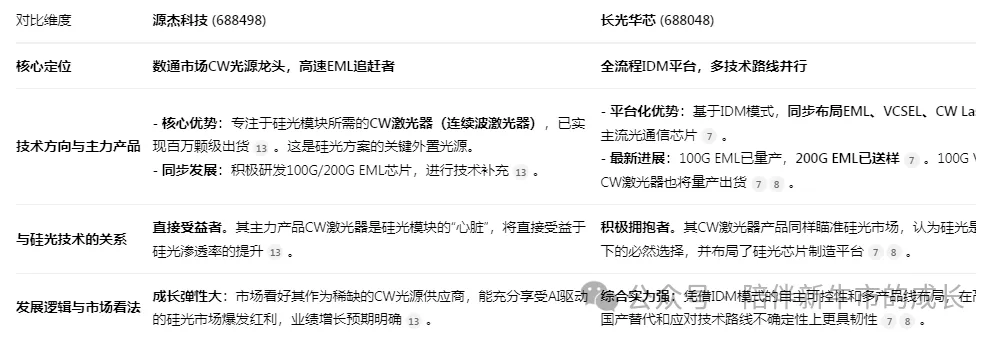 • 长光华芯则像一个“全能选手”,凭借IDM平台在多个高端有源芯片领域同时发力,战略更加全面,抗风险能力更强 7 8 。
