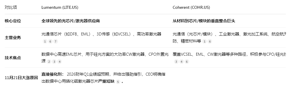 Lumentum(LITE.US)和Coherent(COHR.US)确实是全球光通信产业链中至关重要的上游光芯片和核心元器件供应商。它们周五(11月21日)的大涨,主要驱动力来自于AI算力基础设施需求爆发下,全球高速光芯片出现的严重供应短缺。
