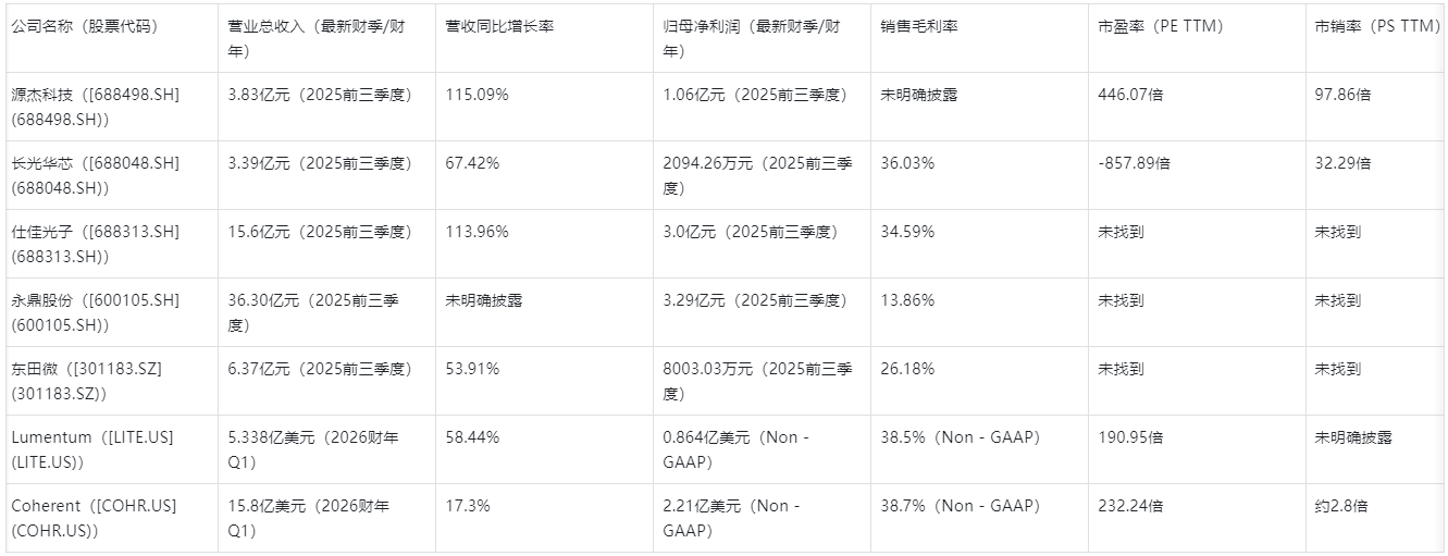 成长质量与估值匹配度:国内企业的高增长确实亮眼,但需要关注其盈利的可持续性。例如,仕佳光子净利润暴增727.74%,其高市盈率(约112倍)包含了市场对AI算力需求持续性的极高预期。相比之下,Coherent约2.8倍的市销率显示出市场对其庞大营收规模但增速放缓的定价,其估值更多由坚实的盈利(Non-GAAP净利润2.21亿美元)和行业地位支撑。