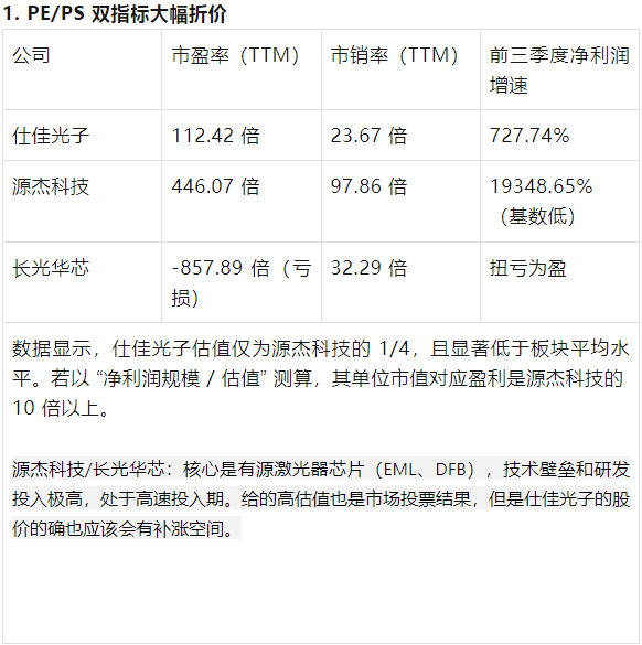 2025Q3 数据显示,仕佳光子前三季度归母净利润达3.00 亿元,同比暴增727.74% ,扣非净利润增速更是高达 1210.13%;反观长光华芯同期净利润仅 2094 万元,源杰科技 1.06 亿元,仕佳光子盈利规模是二者的 14 倍、2.8 倍。单季度维度,其 Q3 营收 5.68 亿元(同比 + 102.5%)、净利润 0.83 亿元(同比 + 242.5%),连续 6 个季度保持营收环比增长,源杰科技高估值反映市场对其在有源芯片领域突破、未来高增长的预期。