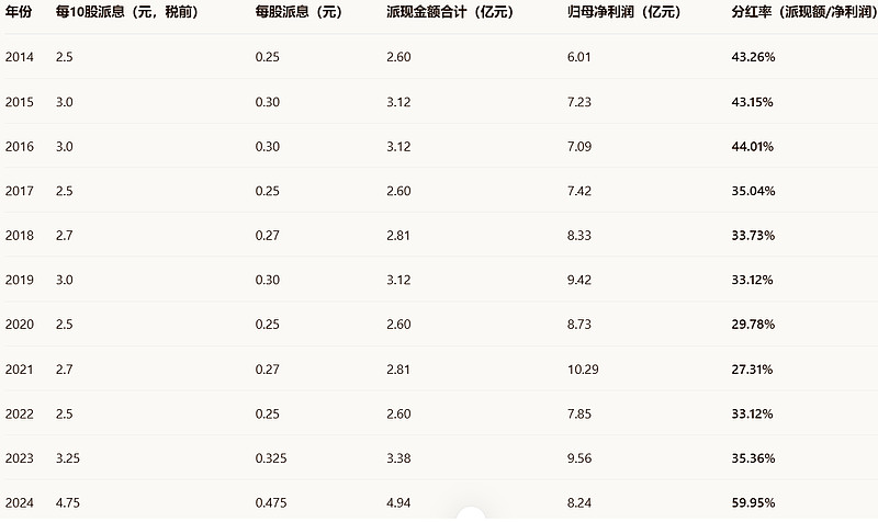 1.长期稳定分红:公司自上市以来持续分红,近十年(2014-2024)分红率基本维持在 30%-45% 的区间,政策非常稳定。